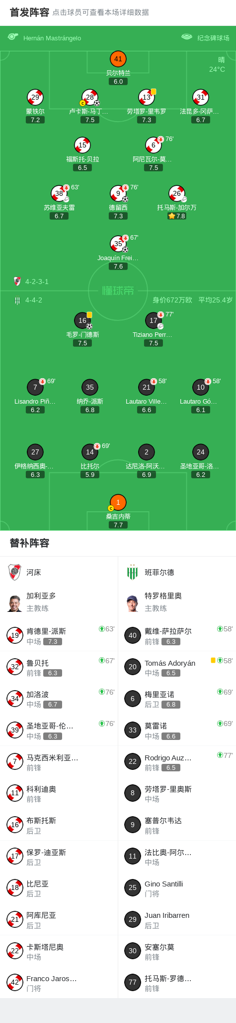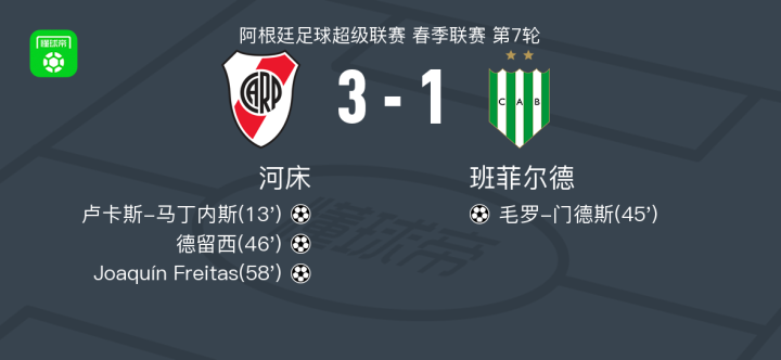 北京时间2月27日阿根廷足球超级联赛 春季联赛 第7轮,河床主场对阵班菲尔德。河床卢卡斯-马丁内斯破门,德留西破门,Joaquín Freitas破门。班菲尔德毛罗-门德斯破门。最终比分河床 3-1 班菲尔德。