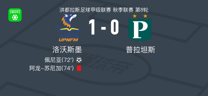北京时间2月27日洪都拉斯足球甲级联赛 秋季联赛 第8轮,洛沃斯墨主场对阵普拉坦斯。洛沃斯墨佩尼亚破门。最终比分洛沃斯墨 1-0 普拉坦斯。