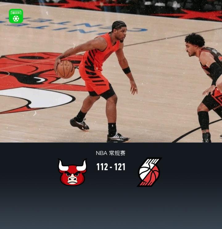 第四节,前半节开拓者罗威、韦斯利连续冲击内线领先来到15分,但随后开拓者突然断电,公牛伦纳德-米勒、布泽利斯领衔一波13-1迫近至3分分差,比赛来到最后2分钟关键时刻,开拓者格兰特三分稳住局面,随后穆雷、霍勒迪相继得分稳住8分领先,比赛逐渐失去悬念,最终公牛112-121不敌开拓者.