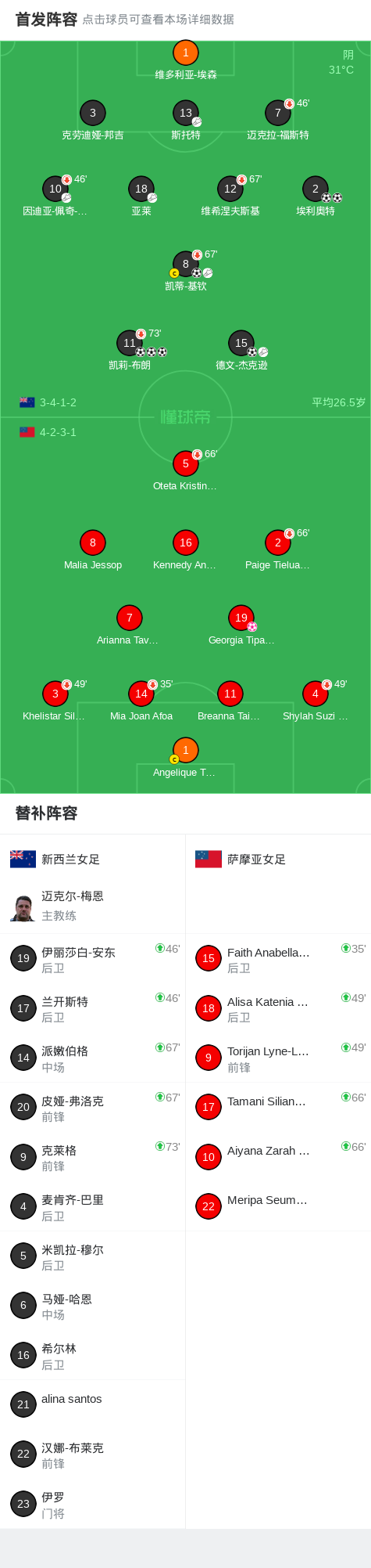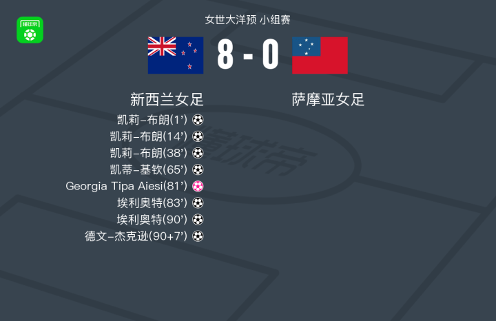 北京时间2月27日女世大洋预 小组赛,新西兰女足对阵萨摩亚女足。新西兰女足凯莉-布朗帽子戏法,凯蒂-基钦破门,埃利奥特梅开二度,德文-杰克逊破门。萨摩亚女足Georgia Tipa Aiesi自摆乌龙。最终比分新西兰女足 8-0 萨摩亚女足。