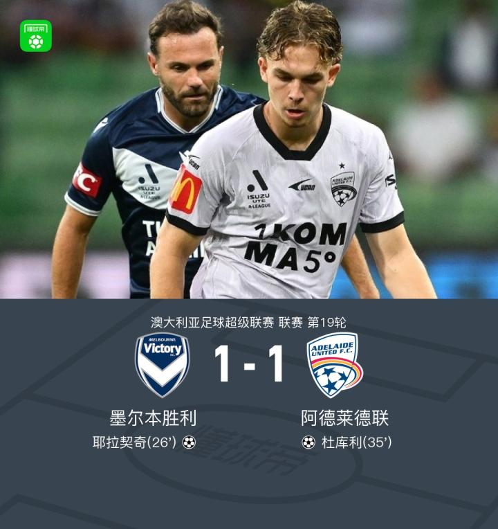 墨尔本胜利1-1阿德莱德联,马塔助攻耶拉契奇破门,杜库利扳平