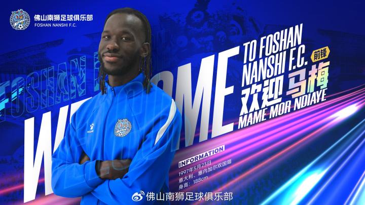 经与球员友好协商达成一致,即日起,意大利、塞内加尔双国籍前锋马梅-莫尔-恩迪亚耶(MAME MOR NDIAYE)正式加入佛山南狮足球俱乐部。他将随队征战新赛季的各项赛事,为球队的进攻线注入新的活力。