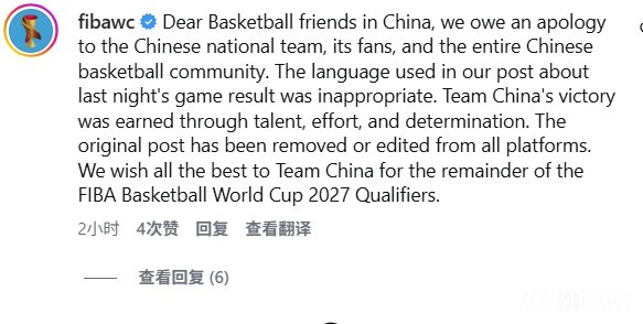 不是中国区限定,FIBA道歉同样出现在措辞不当的帖子的评论区