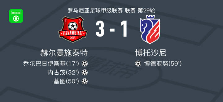 北京时间2月27日罗马尼亚足球甲级联赛 联赛 第29轮,赫尔曼施泰特主场对阵博托沙尼。赫尔曼施泰特乔尔巴日伊斯基破门,内古茨破门,基图破门。博托沙尼博德亚努破门。最终比分赫尔曼施泰特 3-1 博托沙尼。