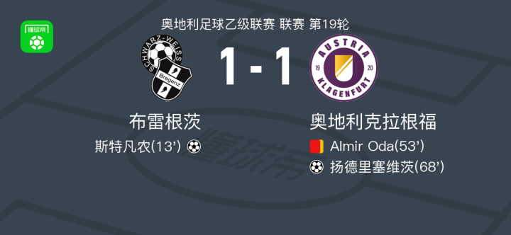 北京时间2月28日奥地利足球乙级联赛 联赛 第19轮,布雷根茨主场对阵奥地利克拉根福。布雷根茨斯特凡农破门。奥地利克拉根福扬德里塞维茨破门。最终比分布雷根茨 1-1 SK奥地利克拉根福。