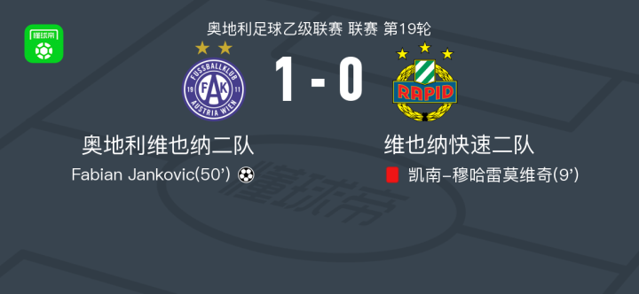 北京时间2月28日奥地利足球乙级联赛 联赛 第19轮,奥地利维也纳二队主场对阵维也纳快速二队。奥地利维也纳二队Fabian Jankovic破门。最终比分奥地利维也纳B队 1-0 维也纳快速B队。