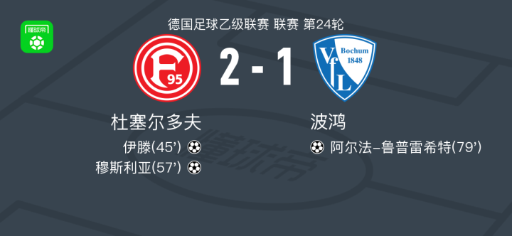 北京时间2月28日德国足球乙级联赛 联赛 第24轮,杜塞尔多夫主场对阵波鸿。杜塞尔多夫伊滕破门,穆斯利亚破门。波鸿阿尔法-鲁普雷希特破门。最终比分杜塞尔多夫 2-1 波鸿。