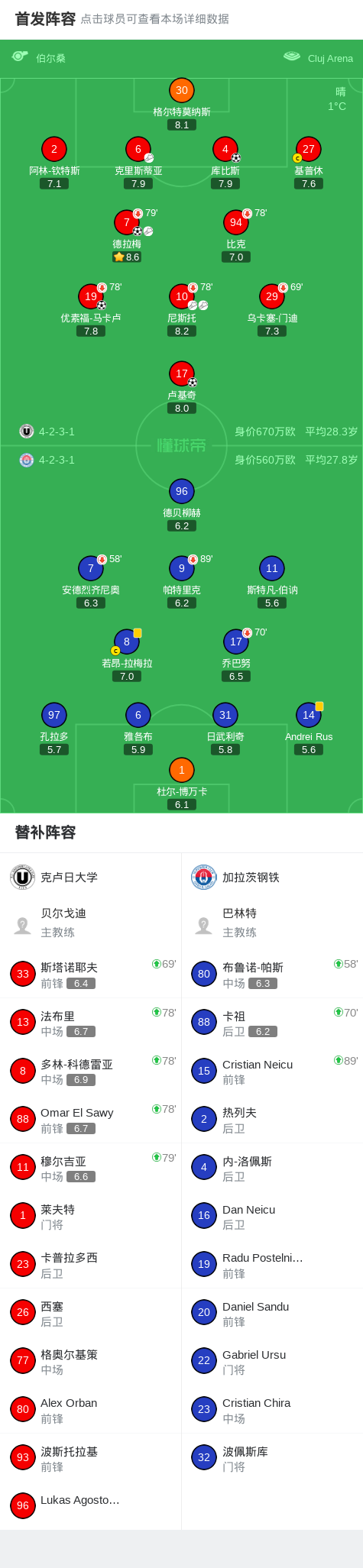 克卢日大学4-0大胜加拉茨钢铁,德拉梅1传1射,库比斯建功