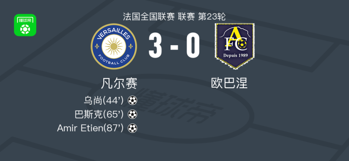 北京时间2月28日法国全国联赛 联赛 第23轮,凡尔赛主场对阵欧巴涅。凡尔赛乌尚破门,巴斯克破门,Amir Etien破门。最终比分维尔塞勒斯 3-0 欧巴涅。