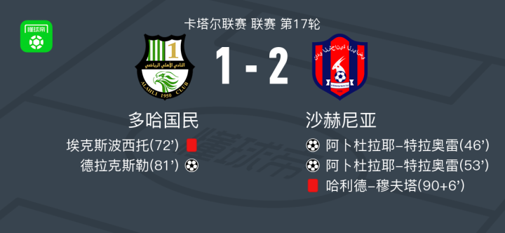 北京时间2月28日卡塔尔联赛 联赛 第17轮,多哈国民主场对阵沙赫尼亚。多哈国民德拉克斯勒破门。沙赫尼亚阿卜杜拉耶-特拉奥雷梅开二度。最终比分多哈国民 1-2 沙赫尼亚。