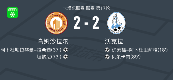 北京时间2月28日卡塔尔联赛 联赛 第17轮,乌姆沙拉尔主场对阵沃克拉。乌姆沙拉尔阿卜杜勒拉赫曼-拉希迪破门,坦纳尼破门。沃克拉优素福-阿卜杜里萨格破门,贝尔卡内破门。最终比分乌姆沙拉尔 2-2 沃克拉。