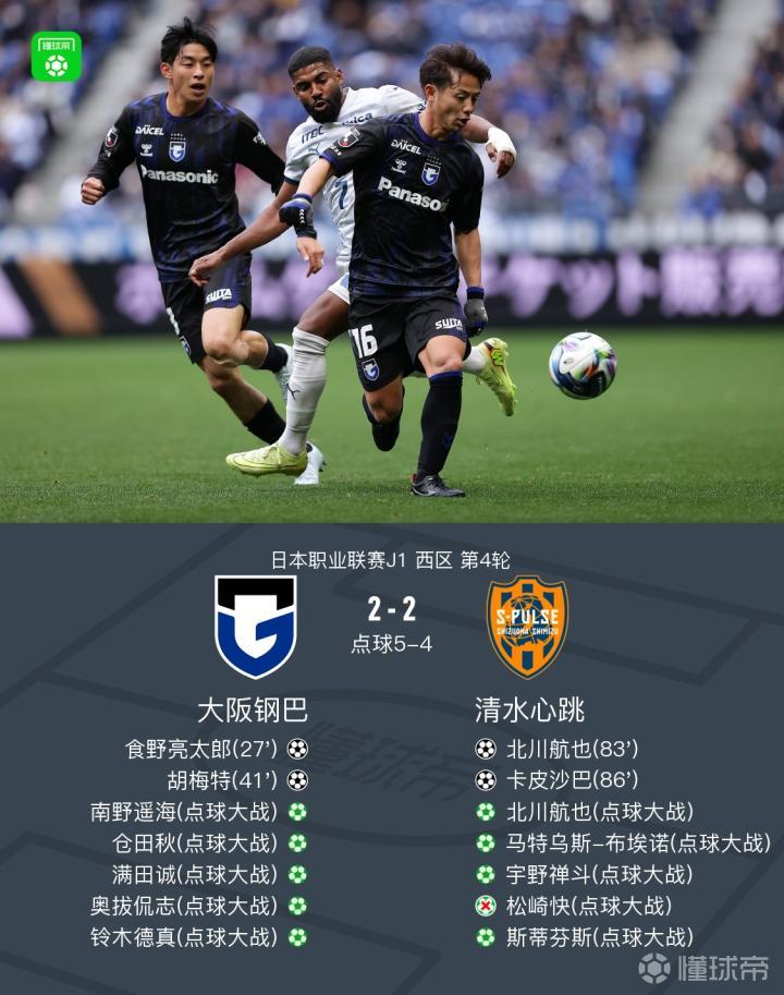 点球大战大阪钢巴7-6战胜清水心跳,卡皮沙巴传射