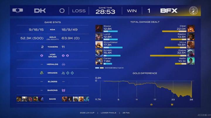 北京时间2月28日,LCK杯败者组决赛在香港启德体育园举行,DK与BFX竞争一张前往第一赛段先锋赛的门票。第一局游戏中,Diable和Kellin的下路双人组彻底摧毁了DK双人组,BFX轻松先下一城,1-0暂时领先。