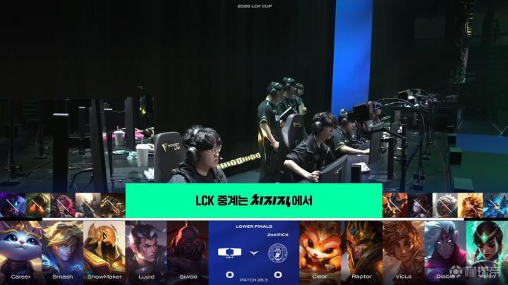 第6分钟,ShowMaker沙皇中路发难,配合Lucid赵信拿下VicLa岩雀一血;