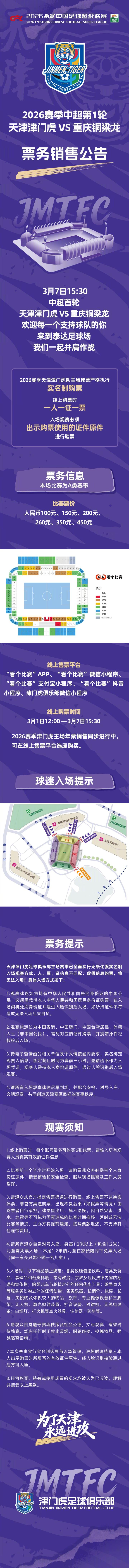 北京时间2月28日,天津津门虎官方公布了2026赛季中超联赛第1轮天津津门虎VS重庆铜梁龙的票务销售公告。
