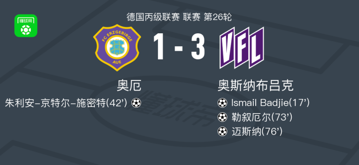 北京时间2月28日德国丙级联赛 联赛 第26轮,奥厄主场对阵奥斯纳布吕克。奥厄朱利安-京特尔-施密特破门。奥斯纳布吕克Ismail Badjie破门,勒叙厄尔破门,迈斯纳破门。最终比分奥厄 1-3 奥斯纳布吕克。
