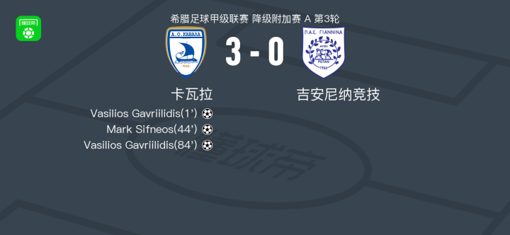 北京时间2月28日希腊足球甲级联赛 降级附加赛 A 第3轮,卡瓦拉主场对阵吉安尼纳竞技。卡瓦拉Vasilios Gavriilidis梅开二度,Mark Sifneos破门。最终比分卡瓦拉 3-0 吉安尼纳竞技。