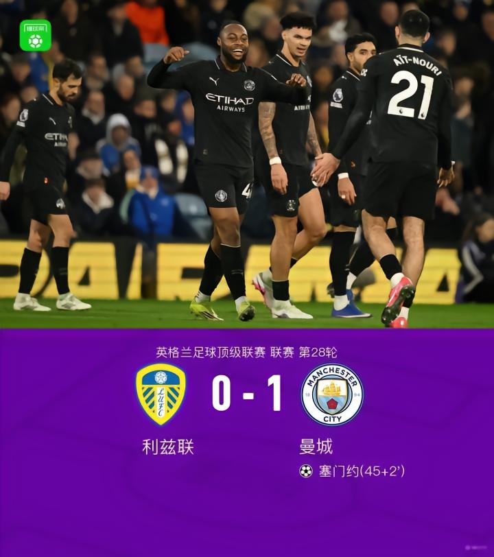 北京时间3月1日英格兰足球顶级联赛 第28轮,利兹联主场对阵曼城。上半场尾声阶段,艾特-努里后插上助攻,塞门约门前抢点破门,打破僵局。最终比分利兹联 0-1 曼城。