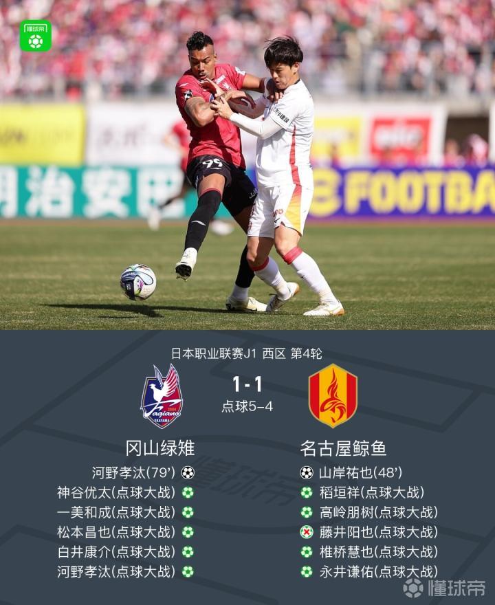 北京时间3月1日日本职业联赛J1 西区 第4轮,冈山绿雉主场对阵名古屋鲸鱼。冈山绿雉河野孝汰破门。名古屋鲸鱼山岸祐也破门。最终比分冈山绿雉 6-5 名古屋鲸鱼。