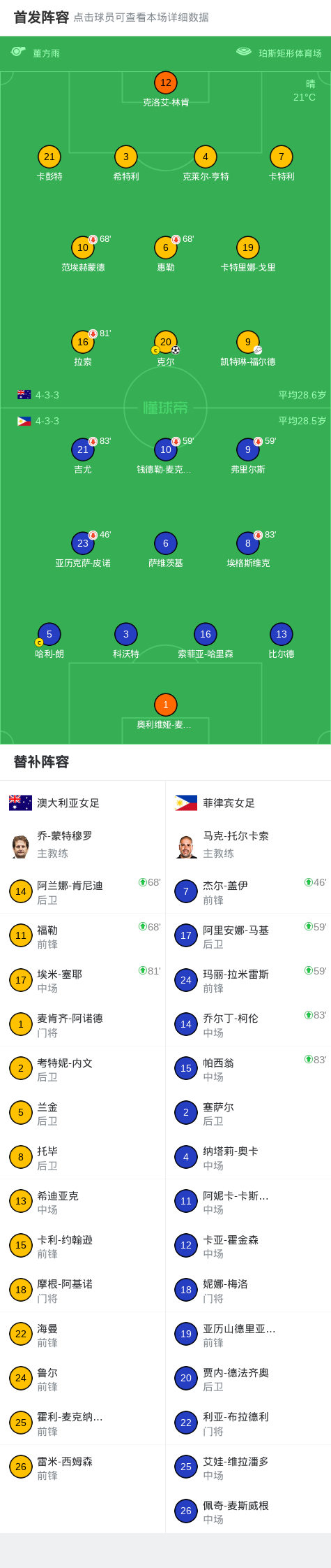澳大利亚女足1-0菲律宾女足,克尔一剑封喉