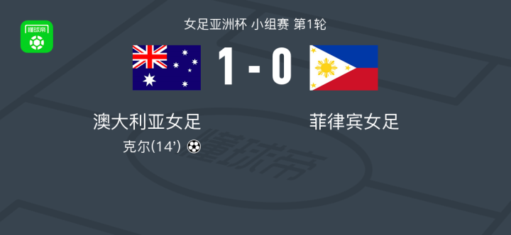 北京时间3月1日女足亚洲杯 小组赛 第1轮,澳大利亚女足对阵菲律宾女足。澳大利亚女足克尔破门。最终比分澳大利亚女足 1-0 菲律宾女足。
