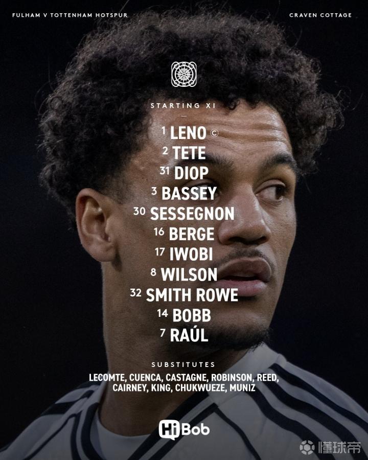 富勒姆首发:1-莱诺、3-巴锡、30-塞塞尼翁、31-迪奥普、2-泰特、32-史密斯-罗、16-桑德-贝格、14-鲍勃、8-哈里-威尔逊、17-伊沃比、7-劳尔-希门尼斯