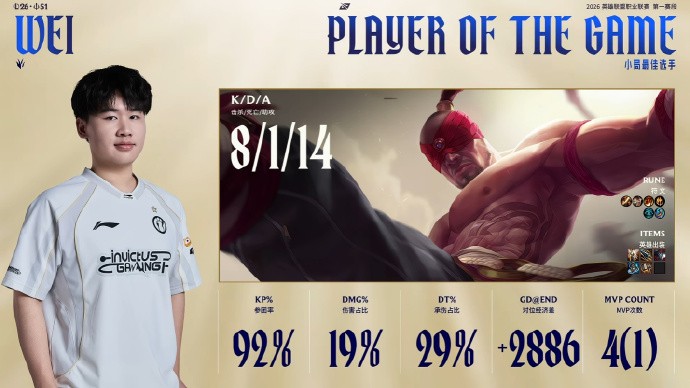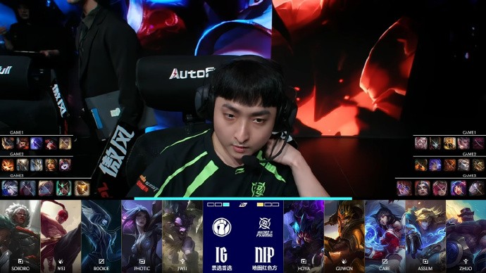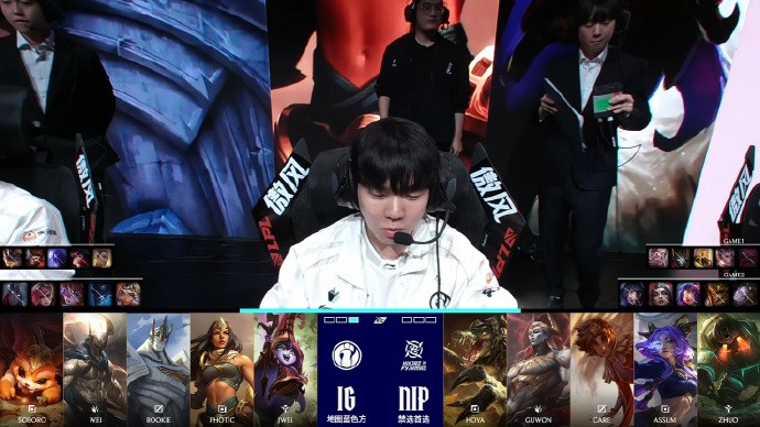 本局Wei的节奏非常好,连续在对方野区和上路有所收获,Soboro兰博上路也完成了单杀,下一波团战iG局势一度很凶险,但Rookie瑞兹站了出来拉扯得当打出1换2。iG拿下大龙和听牌龙后优势扩大至6k,龙魂团NIP进场过于着急被iG逐个击破,iG沿上路推进一波结束比赛!