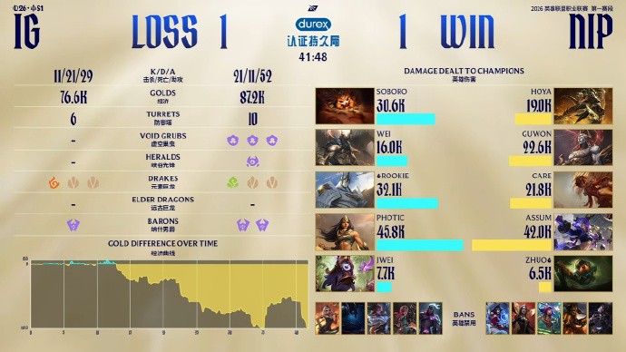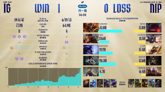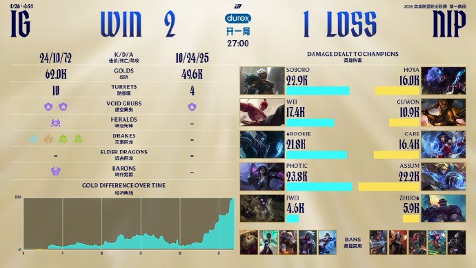 前期Rookie支援下路打出1换2,但Soboro纳尔在上路成为突破口,开局直接0-3。NIP随后持续稳健运营将经济差拉到1w,但Soboro将功补过一波开出好团,iG同样拿到第三条小龙。最后一波团战芸阿娜的输出位置没有受到干扰,NIP还是打赢了团战一波结束比赛!