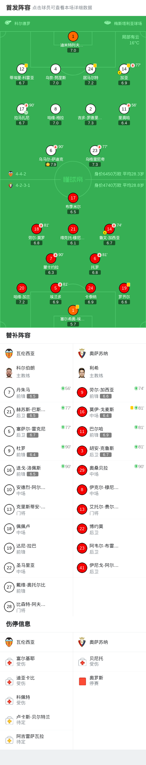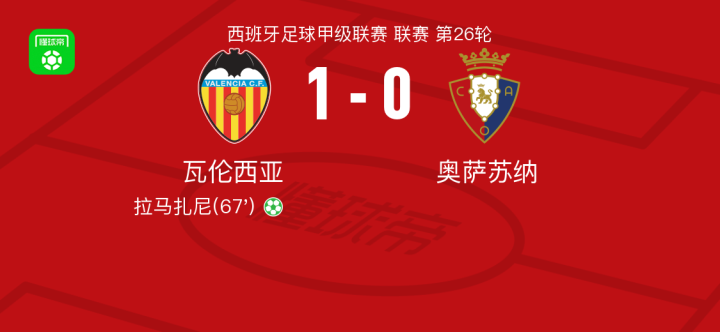 瓦伦西亚1-0奥萨苏纳,拉马扎尼点射制胜战报bot @懂球帝03-02 01:17北京时间3月1日西班牙足球甲级联赛 联赛 第26轮,瓦伦西亚主场对阵奥萨苏纳。瓦伦西亚拉马扎尼破门。最终比分瓦伦西亚 1-0 奥萨苏纳。点击查看本场比赛详细数据>>点击查看西甲完整积分榜>>精彩瞬间第67分钟,瓦伦西亚球员拉马扎尼罚入点球。 球队阵容 技术统计 展开更多