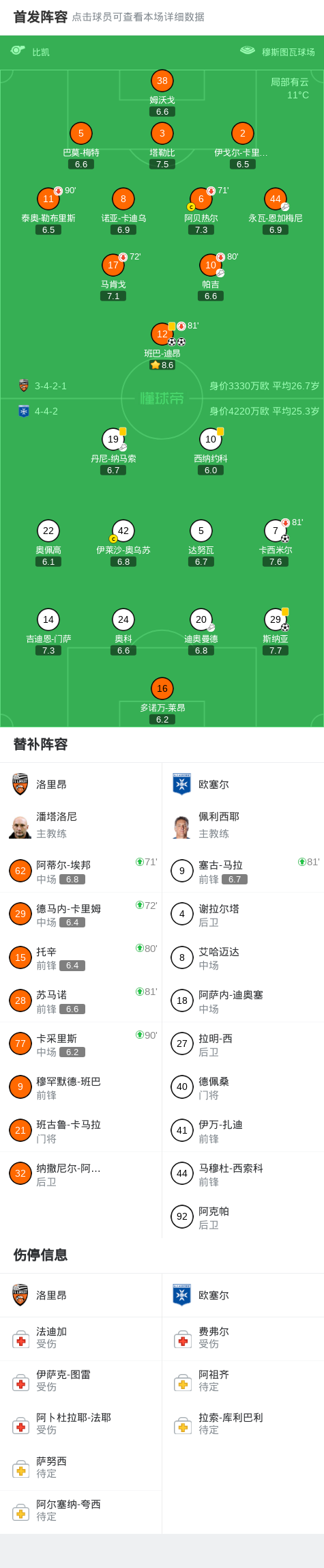 第19分钟,洛里昂球员永瓦-恩加梅尼助攻班巴-迪昂打入一球。