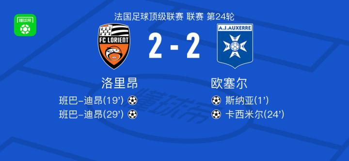 北京时间3月2日法国足球顶级联赛 联赛 第24轮,洛里昂主场对阵欧塞尔。洛里昂班巴-迪昂梅开二度。欧塞尔斯纳亚破门,卡西米尔破门。最终比分洛里昂 2-2 欧塞尔。