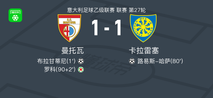 北京时间3月2日意大利足球乙级联赛 联赛 第27轮,曼托瓦主场对阵卡拉雷塞。曼托瓦布拉甘蒂尼破门。卡拉雷塞路易斯-哈萨破门。最终比分曼托瓦 1-1 卡拉雷塞。