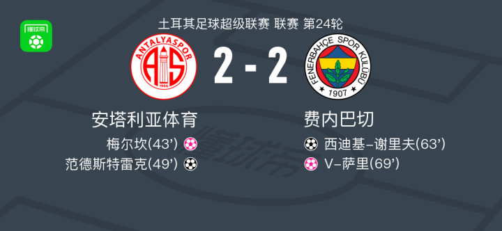 北京时间3月2日土耳其足球超级联赛 联赛 第24轮,安塔利亚体育主场对阵费内巴切。安塔利亚体育范德斯特雷克破门,V-萨里自摆乌龙。费内巴切西迪基-谢里夫破门,梅尔坎自摆乌龙。最终比分安塔利亚体育 2-2 费内巴切。