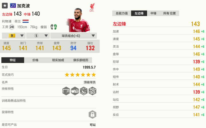荷兰边锋加克波有了最新的赛季版本25U,比起GRU赛季,他的身高继续增加,已经来到193cm。这么高的个子,打边锋其实不利于做微操动作,身体对抗上也不占据优势。25U加克波传中很准,前插后果断下底横传是最佳用法,他在后点也能争顶头球。