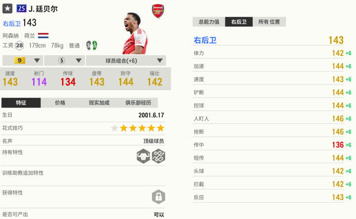 廷贝尔在25U赛季获得了最新的巅峰版本,这张卡还装备了“善于头球”,非常符合他现实里多次头球建功的表现。廷贝尔模型敦实、重心稳定,在挤人超车时很有效果。廷贝尔的防守扎实,很少漏人,他将是阿森纳套右后卫的绝对主力。