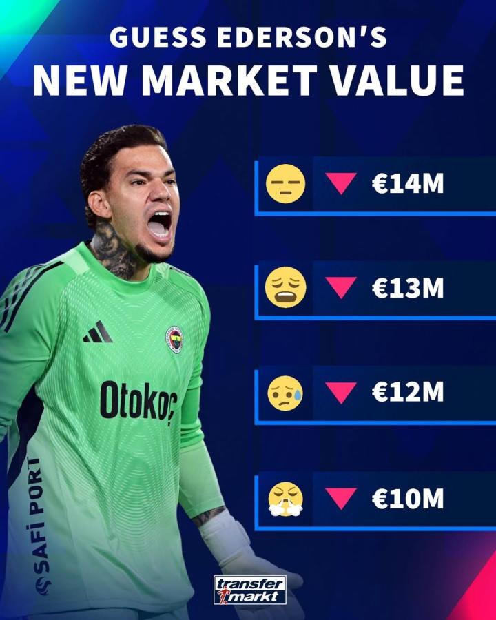 根据德国转会市场公布的信息,埃德森的身价可能跌至1400万欧、1300万欧、1200万欧或者1000万欧,目前他的身价是1500万欧元,是32+岁门将中身价第4高的。