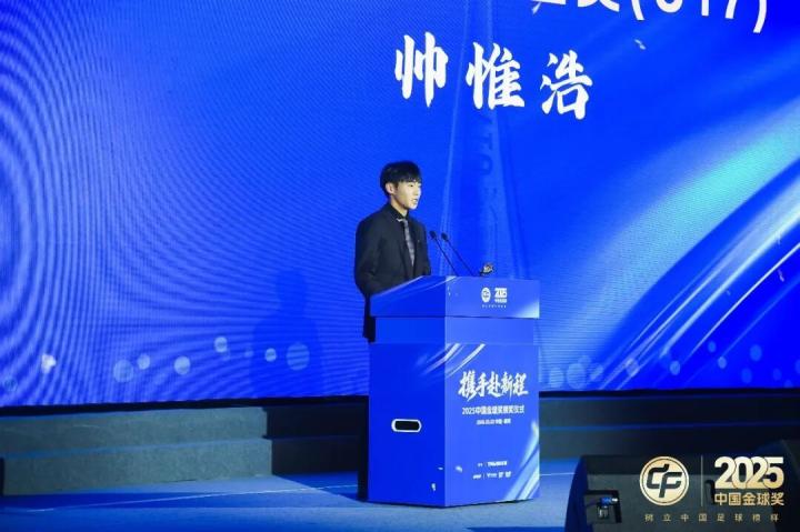 16岁的帅惟浩,站上了2025中国金童奖(U17)的领奖台。这位出生于2009年的成都本地小伙,于2025年3月成为中国职业联赛历史上首位登场的“09后”球员。在2025赛季,他代表成都蓉城B队在中乙联赛出场20次,打入5球。