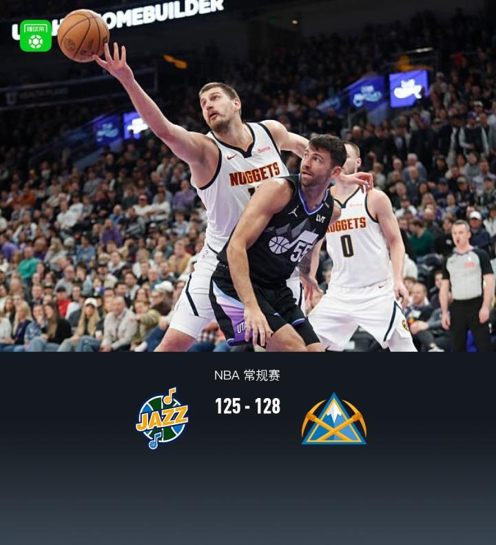 第四节爵士基扬特-乔治拿下15分,掘金贾马尔-穆雷拿下10分,最终爵士125-128不敌掘金