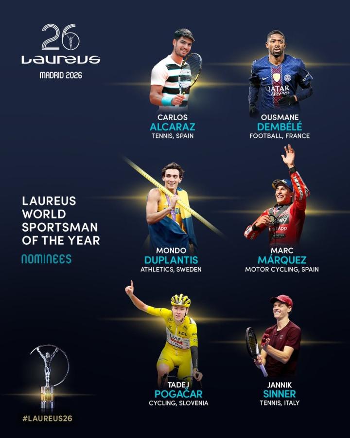 劳伦斯世界体育奖年度最佳男运动员提名:登贝莱、辛纳在列