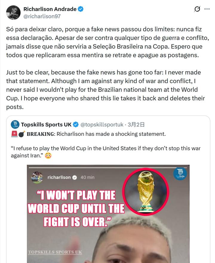 他强调,自己一贯反对任何形式的战争和冲突,但从未表示会因此拒绝代表巴西国家队参加世界杯。“我从未说过自己不会在世界杯上为巴西国家队效力。”里沙利松写道,并呼吁转发相关谣言的账号删除帖子、公开更正。
