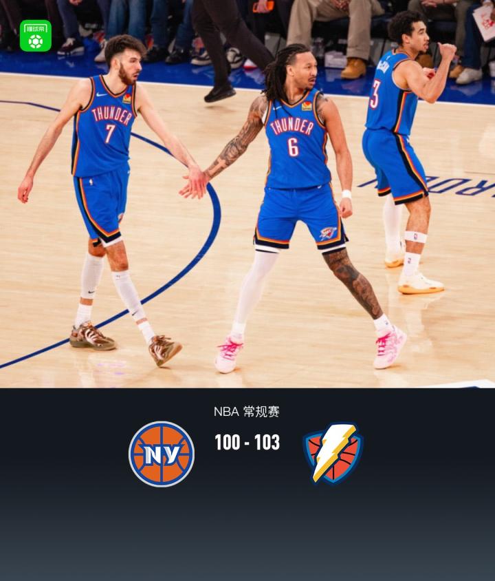 第四节尼克斯约什-哈特拿下6分,雷霆亚历山大拿下7分,最终尼克斯100-103不敌雷霆