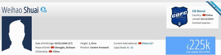2026赛季,帅惟浩并未入选成都蓉城的名单,这或许意味着他至少上半赛季无法代表蓉城出战职业赛事。据了解,帅惟浩目前的注册关系已经转回了成都足协德瑞足球培训中心。