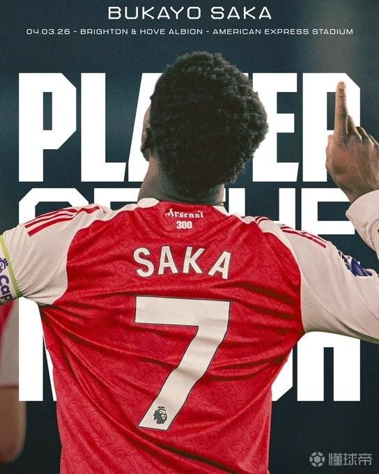 在今天凌晨进行的英超第29轮比赛中,阿森纳客场1-0击败布莱顿,赛后,打入制胜进球的萨卡被阿森纳官方评为本场比赛队内最佳球员。