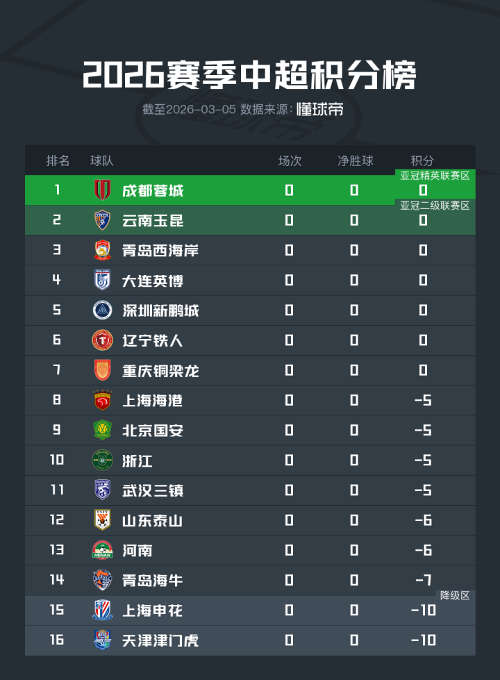 这是2026赛季中超呈现的积分形势,海港、国安、浙江、三镇-5分,山东与河南-6分,海牛-7分,申花与津门虎-10分。9支球队里,有6支是上赛季中超的前七名。