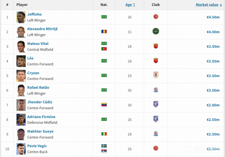 新赛季中超,身价最高的球员是辽宁铁人新援热菲尼奥,铁人花费30万欧将他从巴甲博塔弗戈租借而来。拉唐身价300万欧排名第六,他是2026赛季中超的标王,上海申花花费了200万欧转会费从巴甲巴伊亚将其签下。