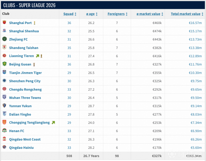 新赛季中超身价最高的是上海海港,但1657万欧的总身价放在金元时期还不如一个大牌外援的身价,其次是上海申花1517万欧。