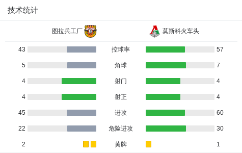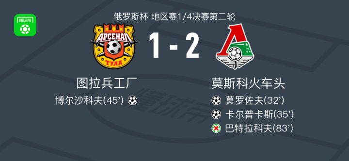 北京时间3月5日俄罗斯杯 地区赛1/4决赛第二轮,图拉兵工厂对阵莫斯科火车头。图拉兵工厂博尔沙科夫破门。莫斯科火车头莫罗佐夫破门,卡尔普卡斯破门。最终比分图拉兵工厂 1-2 莫斯科火车头。