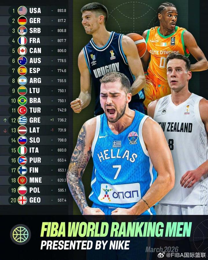 北京时间3月6日,2027年男篮世界杯预选赛第二期结束后,FIBA官方公布了最新一期男篮世界排名,中国男篮的排名上升1位,来到世界第26名。