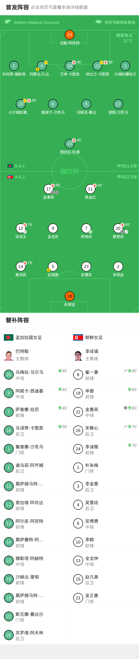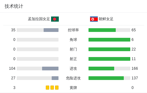 北京时间3月6日女足亚洲杯 小组赛 第2轮,孟加拉国女足对阵朝鲜女足。朝鲜女足明有成破门,金景英梅开二度,蔡恩英破门,金惠英破门。最终比分孟加拉国女足 0-5 朝鲜女足。