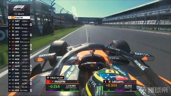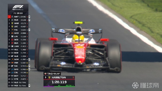 二练过半,大部分车手均已做出软胎成绩。安东内利第一,拉塞尔第二,汉密尔顿第三,勒克莱尔第四。